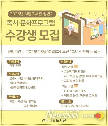 뉴스펀치 박세훈 기자 | 경주시립도서관은 시민들의 독서문화 확산과 평생학습 기회 확대를 위해 '2026년 상반기 독서문화프로그램'을 운영하고 수강생을 모집한다.