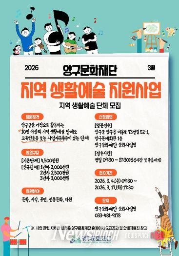 뉴스펀치 조평훈 기자 | 양구문화재단은 군민 중심의 생활문화 영역을 확대하고 지역 생활예술단체의 지속적인 창작 활동 기반을 마련하기 위해 ‘2026 지역 생활예술 지원사업’ 참여 단체를 모집한다.