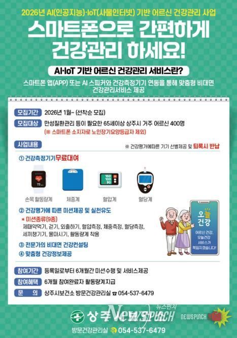 뉴스펀치 박세훈 기자 | 상주시보건소는 지역 어르신의 만성질환 예방과 건강생활 실천을 돕기 위해 녪년 AI·IoT 기반 어르신 건강관리사업’참여자를 3월 말까지 선착순으로 모집한다.