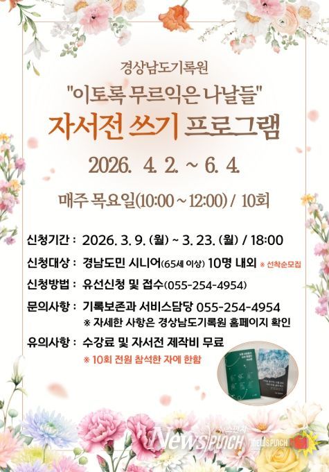 뉴스펀치 박세훈 기자 | 경상남도기록원은 9일부터 23일까지 ‘이토록 무르익은 나날들 – 시니어 자서전 쓰기’ 프로그램 참여자를 모집한다고 밝혔다.