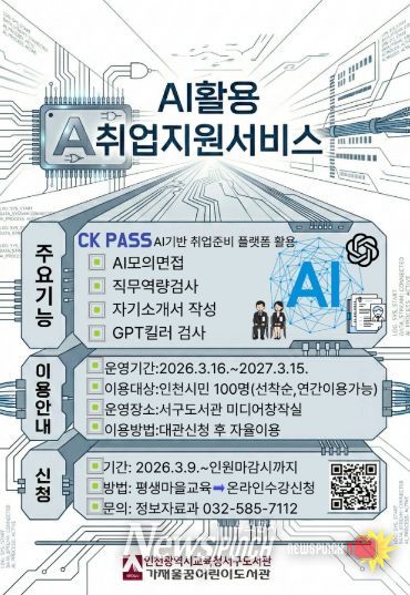 뉴스펀치 정홍균 기자 | 인천광역시교육청서구도서관은 최근 급변하는 채용 트렌드에 맞춰 취업을 준비하는 시민에게 실질적인 도움을 주고자, 16일부터 ‘2026 AI 활용 취업지원 서비스’를 운영한다.