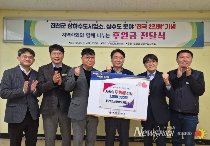 뉴스펀치 이현승 기자 | 충북 진천군 상하수도사업소(소장 연성훈)는 진천군 장애인복지관(관장 이재성)에 후원금 300만원을 전달했다고 9일 밝혔다.