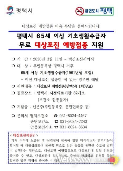 뉴스펀치 박상훈 기자 | 평택시는 65세 이상 취약계층 어르신의 건강증진과 예방접종 비용 부담 완화를 위해 ‘대상포진 예방접종을 연중 무료로 지원’한다고 밝혔다.