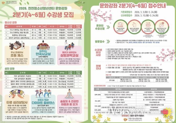 뉴스펀치 박상훈 기자 | 수원시청소년청년재단 천천청소년청년센터는 오는 3월 10일부터 지역주민과 청소년의 활기찬 일상을 지원하기 위한 2026년 2분기 문화강좌 신규 수강생을 모집한다고 밝혔다.