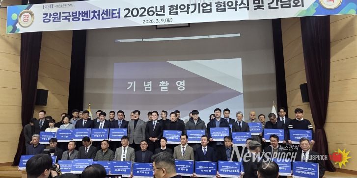뉴스펀치 조평훈 기자 | 강원특별자치도는 3월 9일 오후 2시 강원대학교 60주년기념관에서 김광래 도 경제부지사 주재로 도내 중소·벤처기업의 방산 진출을 지원하기 위한 '2026년 강원국방벤처센터 협약식'을 개최했다.