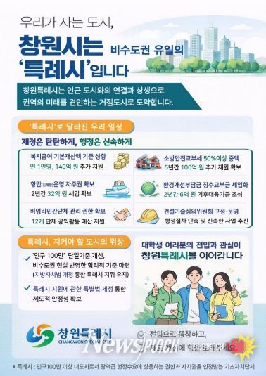 캠페인은 3월 11일 경남대학교, 3월 25일 창원대학교에서 진행되며, 특례시 제도와 주요 성과를 소개하는 홍보물을 배포해 학생들의 이해를 돕는다. 아울러 창원시 주요 청년정책도 함께 홍보해 청년들이 체감할 수 있는 정책 정보 제공도 병행할 계획이다.
