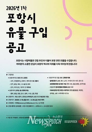 뉴스펀치 박세훈 기자 | 포항시는 시립박물관 건립을 위한 전시 자원 확보를 위해 오는 16일부터 20일까지 ‘2026년 1차 포항시 유물 구입’을 진행한다고 밝혔다.