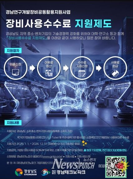 뉴스펀치 박세훈 기자 | 경상남도는 연구개발장비의 공동활용을 활성화하고 도내 기업의 기술경쟁력 강화를 위해 ‘2026년 연구개발장비 공동활용지원사업’을 시행한다고 밝혔다.