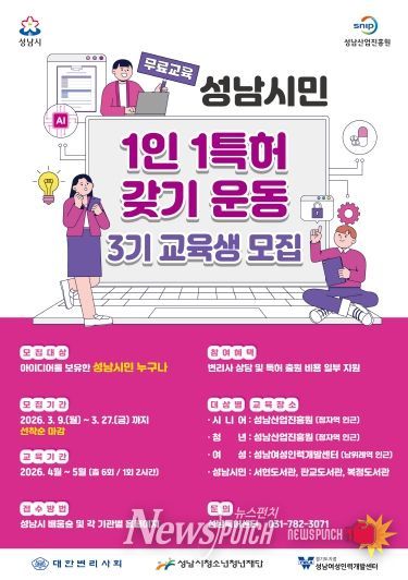 뉴스펀치 박상훈 기자 | 성남산업진흥원은 시민의 창의적인 아이디어를 지식재산으로 보호하고 창업으로 연결하기 위해 '성남시민 1인 1특허 갖기 운동' 제3기 교육생을 모집한다고 밝혔다.