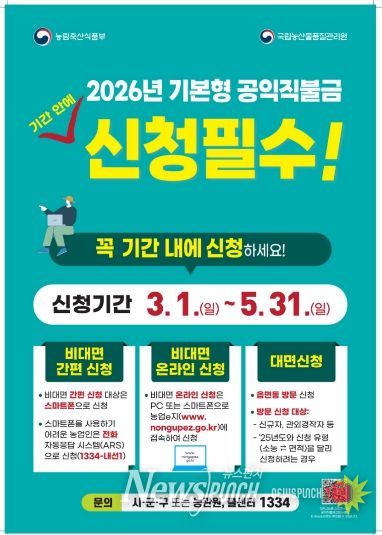 뉴스펀치 박세훈 기자 | 문경시는 농업인의 소득 안정을 위한 ‘2026년 기본형 공익직접지불금’신청을 3월 1일부터 5월 31일까지 농지 소재지 읍·면·동 행정복지센터 방문 또는 스마트폰, 인터넷, ARS를 통해 받는다.