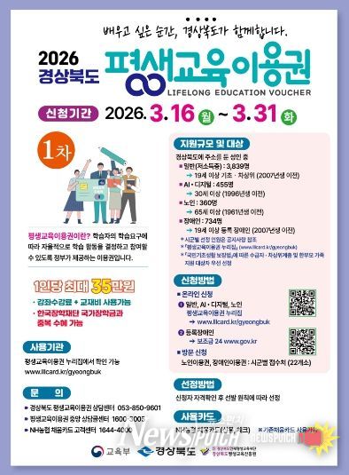 뉴스펀치 박세훈 기자 | 고령군은 군민의 자아실현과 평생학습 기회 확대를 위해 오는 3월 16일부터 31일까지 '2026년 고령군 평생교육 이용권 지원사업' 신청을 접수한다고 밝혔다.