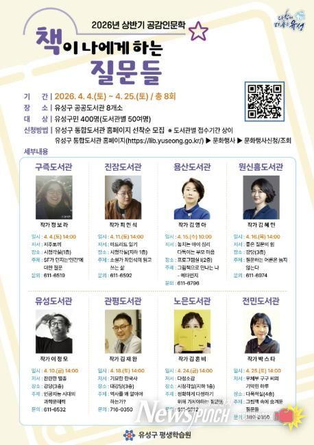 뉴스펀치 이현승 기자 | 대전 유성구는 4월 한 달간 관내 8개 공공도서관에서 도서관의 날·도서관 주간을 맞아 ‘2026년 상반기 공감인문학 강연’을 운영한다.