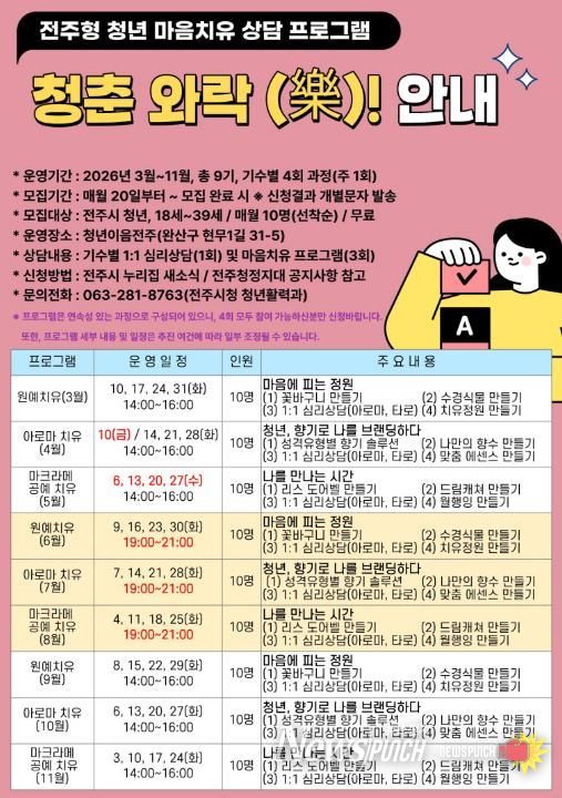 뉴스펀치 정홍균 기자 | 전주시는 학업 스트레스와 취업 준비, 사회적 관계 단절 등으로 심리적 무기력을 겪는 지역 청년들의 마음건강을 돌보기 위해 2026 전주형 청년 마음치유 상담 프로그램인 ‘청춘와락(樂)’을 본격 추진한다고 10일 밝혔다.