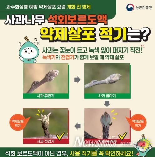 또한 과수의 생육 단계를 확인한 뒤 적기에 1차 약제를 살포해야 하며, 석회유황합제와 함께 살포할 경우 약해가 발생할 수 있어 석회유황합제 살포 후 최소 7일 이상의 간격을 두어야 한다.