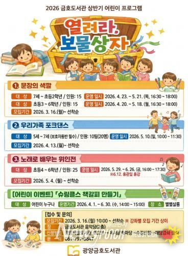한편, 2026년 금호도서관 상반기 어린이 프로그램과 관련한 자세한 사항은 광양시립도서관 누리집에서 확인하거나 금호도서관으로 문의하면 안내받을 수 있다.
