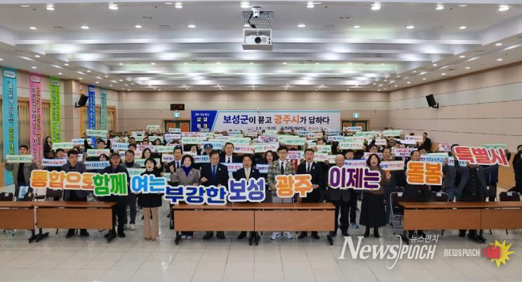 뉴스펀치 김용희 기자 | 보성군은 지난 9일 보성군청 대회의실에서 7월 전남·광주 행정통합 출범을 앞두고 양 지역의 연계 발전 방향을 모색하는 ‘광주·전남 통합 보성군 상생토크’를 성황리에 개최했다고 밝혔다.