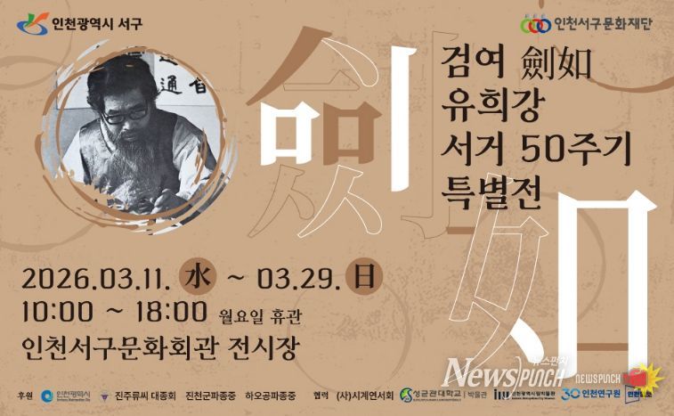 뉴스펀치 정홍균 기자 | (재)인천서구문화재단은 오는 3월 11일부터 3월 29일까지 인천서구문화회관 전시장에서 ‘검여 유희강 선생 50주기 기념 특별전’을 개최한다.