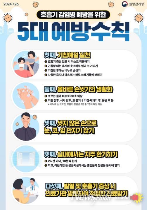 호흡기 감염병 예방을 위한 5대 수칙은 기침 예절 실천, 올바른 손 씻기의 생활화, 씻지 않은 손으로 눈, 코, 입 만지지 않기, 실내에서는 자주 환기하기, 발열 및 호흡기 증상 시 의료기관 방문하여 적절한 진료 받기이다.