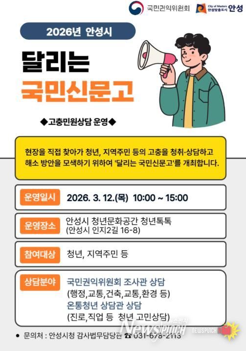 뉴스펀치 박상훈 기자 | 안성시는 오는 12일 오전 10시부터 오후 3시까지 청년문화공간 ‘청년톡톡’(인지2길 16-8)에서 국민권익위원회와 함께 ‘달리는 국민신문고’를 운영한다.