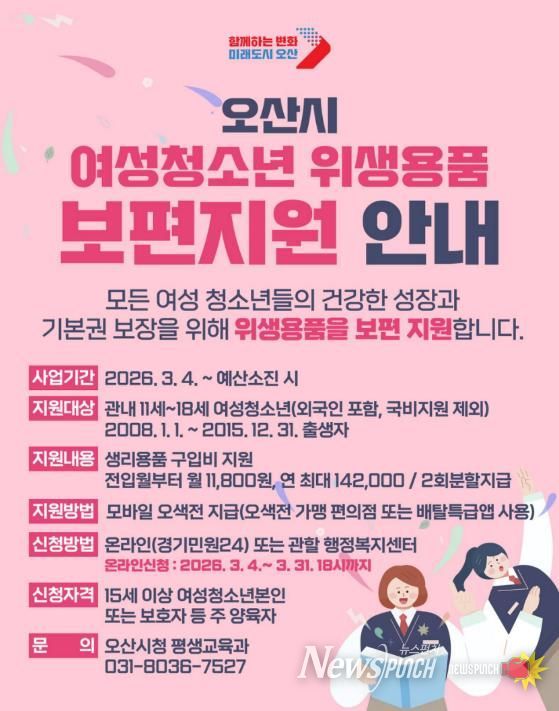 뉴스펀치 박상훈 기자 | 오산시는 관내 11세부터 18세까지의 여성청소년을 대상으로 '여성청소년 위생용품 보편지원 사업'을 추진한다고 밝혔다.