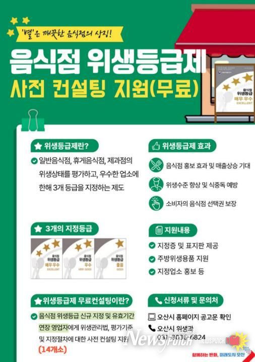 뉴스펀치 박상훈 기자 | 오산시는 관내 음식점의 위생 수준 향상과 안전한 외식환경 조성을 위해 ‘음식점 위생등급제(식품안심업소) 사전 컨설팅’ 참여 업소를 모집한다고 10일 밝혔다.