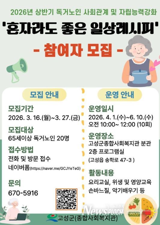 뉴스펀치 박세훈 기자 | 고성군이 운영하는 고성군종합사회복지관은 오는 3월 16일부터 관내 65세이상 독거노인을 대상으로 2026년 상반기 독거노인 사회관계 및 자립능력강화 프로그램'혼자라도 좋은 일상레시피' 참여자 20명을 모집한다.