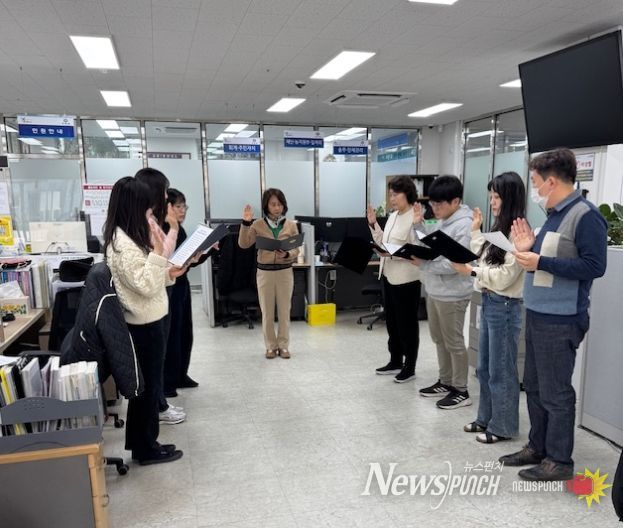 뉴스펀치 박상훈 기자 | 구리시 교문1동 행정복지센터는 지난 9일 민원인에게 더 친절하고 책임감 있는 행정서비스를 제공하기 위해‘민원 친절 다짐 선언’을 실시했다.