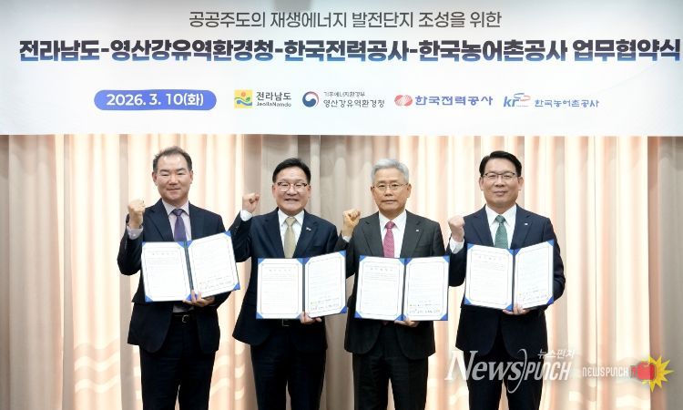 뉴스펀치 김용희 기자 | 전라남도는 10일 한국전력공사 회의실에서 한국전력, 한국농어촌공사, 영산강유역환경청과 공공 주도 재생에너지 발전단지 조성과 안정적 전력 공급을 위한 업무협약을 했다.