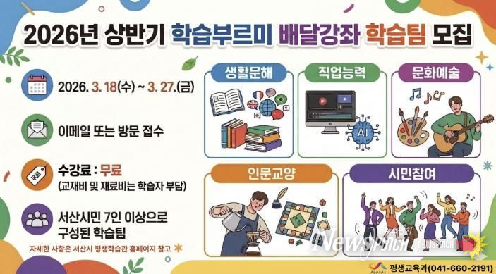 뉴스펀치 이현승 기자 | 충남 서산시는 오는 3월 18일부터 27일까지 ‘2026년 상반기 학습부르미 배달강좌’에 참여할 학습팀을 모집한다고 밝혔다.