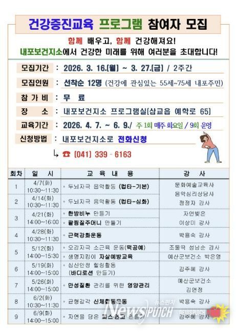 뉴스펀치 이현승 기자 | 예산군 내포보건지소는 지역 주민의 건강증진과 활기찬 노후생활 지원을 위해 ‘2026년 건강증진교육 프로그램’ 참여자 12명을 오는 27일까지 선착순 모집한다.