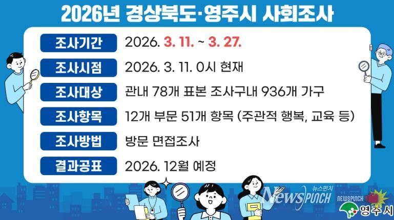 뉴스펀치 박세훈 기자 | 시민의 생활 수준과 사회 인식을 종합적으로 파악해 정책 수립의 기초자료로 활용하기 위한 ‘2026년 경상북도·영주시 사회조사’가 실시된다.