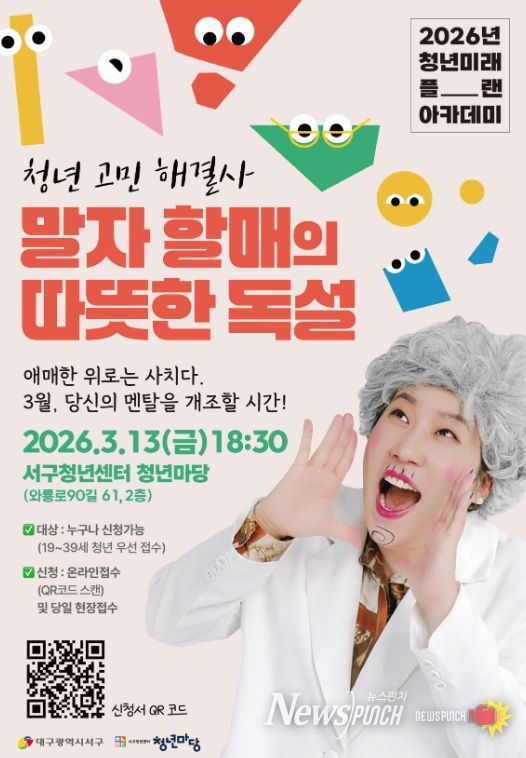 뉴스펀치 조평훈 기자 | 대구 서구는 오는 13일 금요일 오후 6시 30분, 서구청년센터 청년마당에서 말자할매(개그우먼 김영희)를 초청해 ‘2026년 제1차 청년 미래플랜 아카데미’를 개최한다.