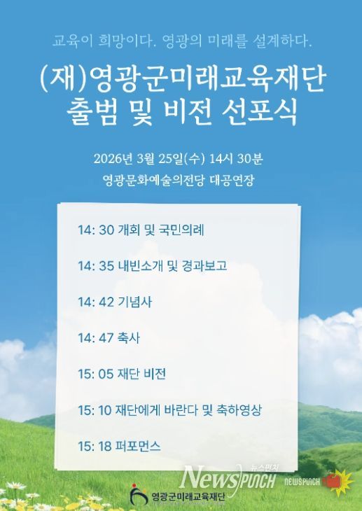 뉴스펀치 김용희 기자 | 영광군미래교육재단은 오는 3월 25일 오후 2시 30분, 영광문화예술의전당 대공연장에서 '영광군미래교육재단 출범 및 비전선포식'을 개최한다.