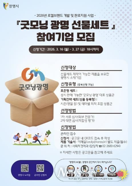 모집 대상은 선물세트 제작이 가능한 제품을 보유한 광명시 소재 중소기업, 사회적경제기업, 소상공인 등이다. 광명에서 생산·제조한 생활용품, 식품, 공예품 등 특판이 가능한 전 품목이 해당하며, 선정된 제품은 ‘굿모닝광명’ 브랜드 로고와 전용 패키지를 입혀 세련된 세트 상품으로 재탄생한다.