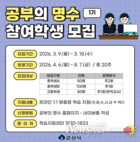 뉴스펀치 정홍균 기자 | 군산시는 교육격차 해소와 학생 맞춤형 학습 지원을 위해 ‘공부의 명수’ 온라인 튜터링 1기 참여 학생을 모집한다고 밝혔다.
