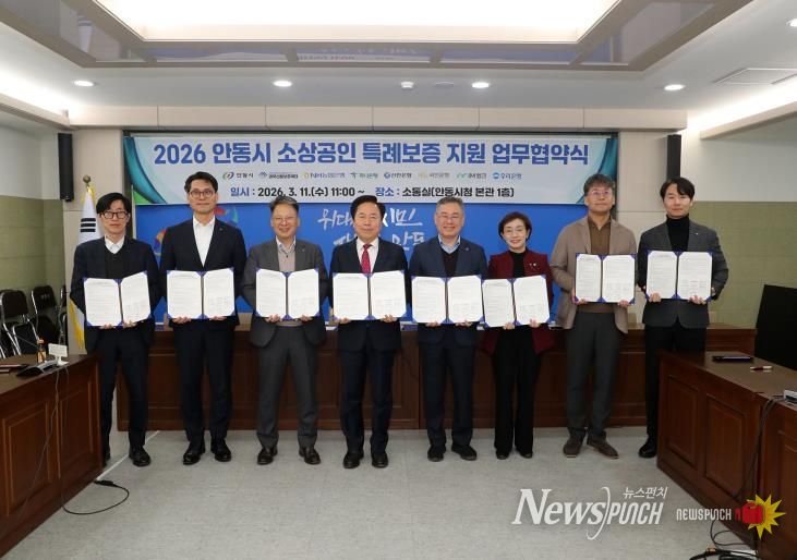 뉴스펀치 박세훈 기자 | 안동시는 3월 11일 시청 소통실에서 경북신용보증재단 및 6개 협약은행과 함께 '2026년 안동시 소상공인 특례보증 지원 업무협약'을 체결했다.