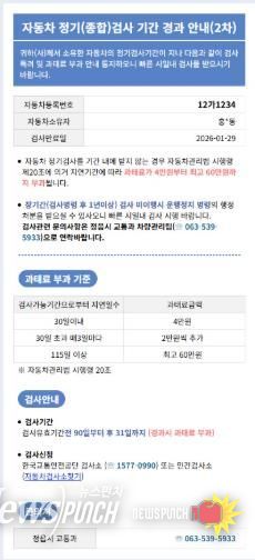 뉴스펀치 정홍균 기자 | 정읍시가 시민들이 우편물을 직접 확인해야 하는 번거로움을 줄이고 언제 어디서나 편리하게 행정 안내를 받을 수 있도록, 자동차 정기검사 및 의무보험 경과 안내를 모바일 전자고지 서비스로 확대 시행한다.