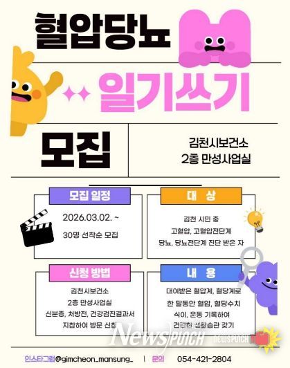 뉴스펀치 박세훈 기자 | 김천시는 고혈압·당뇨병 환자 및 고위험군 시민들을 대상으로 자기 주도적 건강관리 능력을 키우기 위한 ‘혈압·혈당 일기 쓰기’ 참여자를 모집한다.