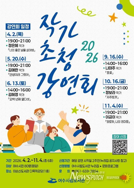 뉴스펀치 김용희 기자 | 여수시가 오는 4월부터 시민과 작가가 직접 만나는 ‘시립도서관 작가 초청 강연회’를 개최한다.
