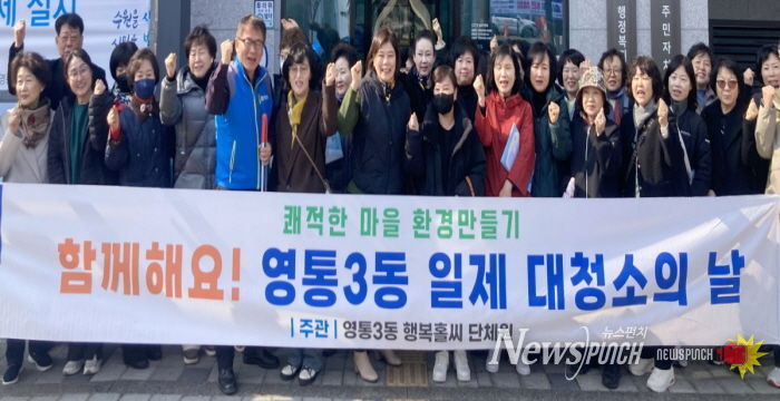 뉴스펀치 박상훈 기자 | 수원시 영통구 영통3동 행정복지센터는 지난 12일 새봄을 맞아 쾌적하고 깨끗한 마을 환경 조성을 위해 통장협의회와 함께 ‘새봄맞이 일제 대청소의 날’을 실시했다.