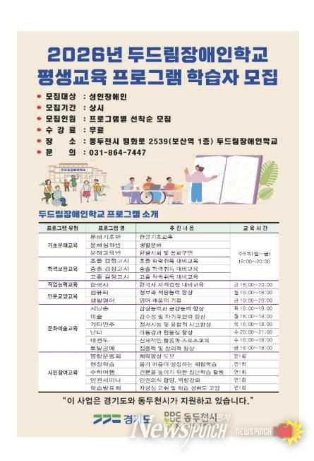 뉴스펀치 박상훈 기자 | 동두천시가 장애인 평생교육 진흥을 위해 지원하고 있는 두드림장애인학교가 2026학년도 평생교육 프로그램 학습자를 모집한다.