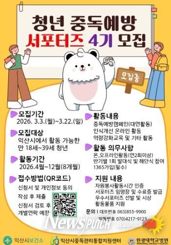 익산시는 중독관리통합지원센터에서 만 18~39세 청년을 대상으로 오는 22일까지 '청년 중독 예방 서포터즈 4기'를 모집한다고 13일 밝혔다.