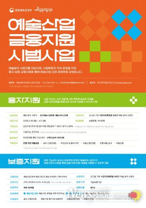 뉴스펀치 정홍균 기자 | 문화체육관광부는 (재)예술경영지원센터와 함께 예술산업의 성장 기반을 만들기 위해 총 437억 5천만 원 규모의 융자와 보증을 신설한다. 융자는 엔에이치(NH)농협은행과 하나은행, 보증은 기술보증기금과 함께 추진한다. 융자는 3월 16일부터, 보증은 4월 1일부터 희망 사업자를 공모한다.
