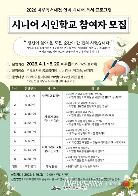 뉴스펀치 김용희 기자 | 제주시 우당도서관은 2026 제주독서대전과 연계해 시민의 삶과 경험을 문학적 가치로 재발견하는 특별 프로그램인 ‘시니어 시인학교’ 참여자를 모집한다.