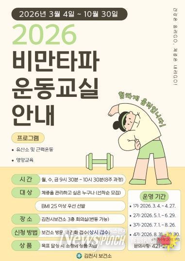 뉴스펀치 박세훈 기자 | 김천시는 지역 주민의 건강증진과 비만 예방을 위해 ‘비만타파 운동 교실’ 참가자를 모집한다고 밝혔다. 모집 대상은 신체질량지수(BMI) 25 이상 또는 체중 관리를 희망하는 시민이다.