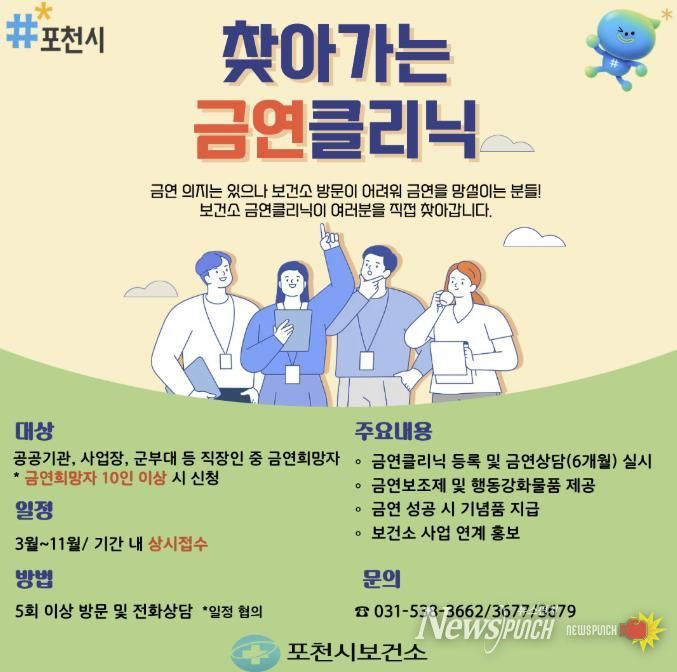 뉴스펀치 박상훈 기자 | 포천시는 지역사회 흡연율 감소 및 시민 건강증진을 위하여 공공기관, 사업장, 군부대 등을 대상으로 ‘찾아가는 금연클리닉’ 참여 기관을 모집한다고 밝혔다.