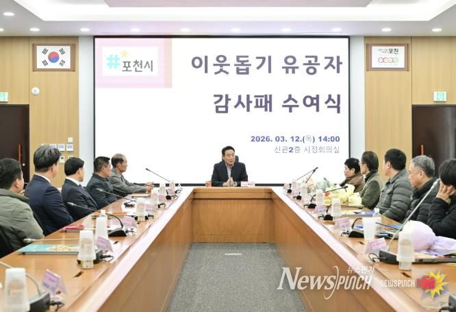 뉴스펀치 박상훈 기자 | 포천시는 지난 12일 시정회의실에서 '이웃돕기 유공자 감사패 수여식'을 개최하고, 지역사회 나눔 문화 확산에 기여한 후원자들에게 감사패를 전달했다.