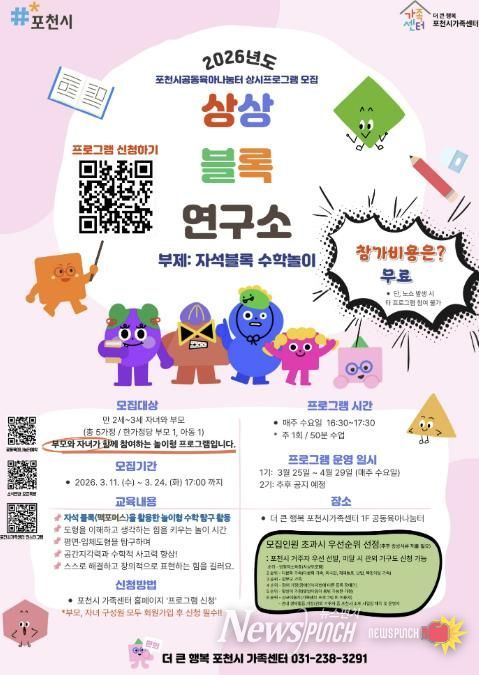 더 큰 행복 포천시가족센터장(겸임 가족여성과장 최선희)은 “아이들이 놀이를 통해 자연스럽게 사고력과 창의력을 기를 수 있도록 다양한 체험형 프로그램을 지속적으로 운영할 계획”이라며 “앞으로도 공동육아나눔터를 중심으로 부모와 아이가 함께 성장할 수 있는 가족 친화 프로그램을 확대해 나가겠다”고 밝혔다.