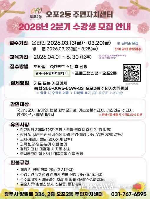 뉴스펀치 박상훈 기자 | 광주시 오포2동 주민자치센터는 오는 4월 1일 개관을 앞두고 3월 13일부터 20일까지 ‘2026년 2분기 주민자치 프로그램’ 수강생 924명을 선착순 모집한다.