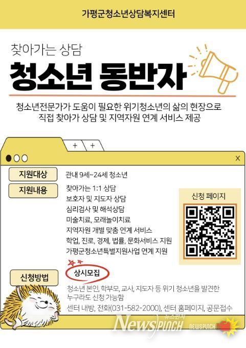 뉴스펀치 박상훈 기자 | 가평군청소년상담복지센터는 청소년 상담 분야 자격과 경험을 갖춘 전문상담사가 위기 청소년을 지원하는 ‘청소년동반자 프로그램’을 운영중이라며 적극적인 이용을 당부했다.